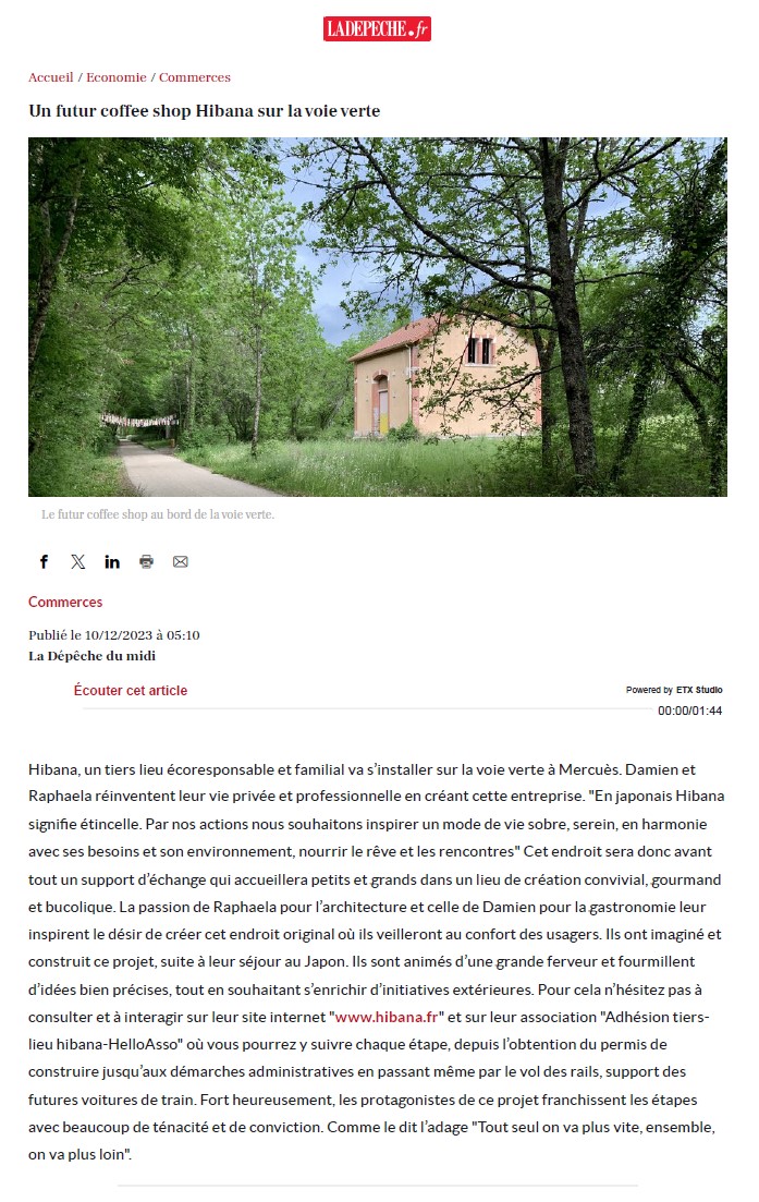 L’ancien hangar SNCF, chaleureux et bucolique, comprendra un coffee shop, un espace de coworking et un hébergement dans une voiture de train (ça nous fait déjà rêver !). Ancré dans un tissu économique local, le tiers-lieu hibana permettra à chacun de participer à la transition écologique et sociale. Il favorise les échanges et le partage des savoirs autour d’une frugalité joyeuse et créative.